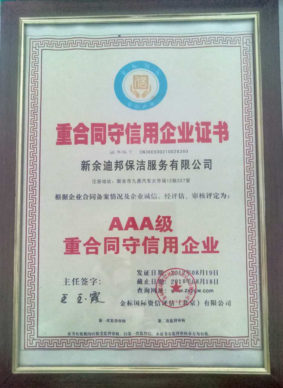 新余迪邦保潔服務(wù)有限公司獲得北京金標國際資信有限公司評為AAA級重合同守信用企業(yè)